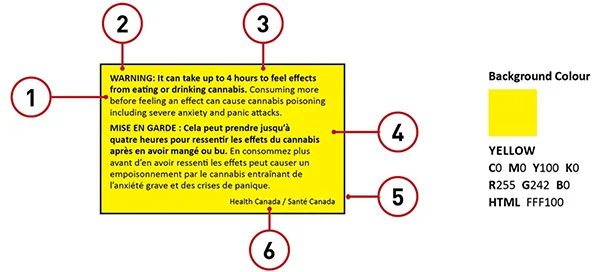- The source attribution must read “Health Canada / Santé Canada” if there’s one display panel or “Health Canada” and “Santé Canada” on separate English and French panels. Use a font size of at least 6 points, smaller than the health warning text.